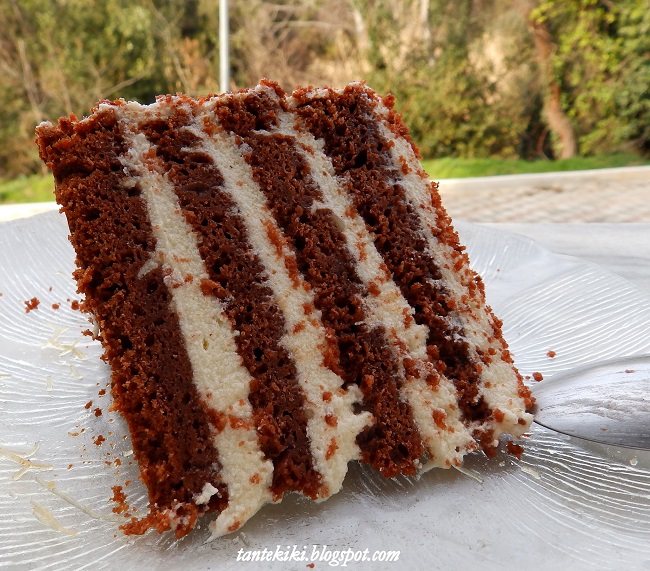Η συνταγή για το κέικ αλλά και την βουτυρόκρεμα, αν και μερικώς διαφοροποιημένα, ανήκουν στο "Magnolia Bakery". Βέβαια, ο "δαίμων" της δικής μου κουζίνας αφαίρεσε το χρώμα (το κέικ ήταν red velvet) για ευνόητους λόγους, μείωσε την ζάχαρη και στο κέικ αλλά και στην κρέμα και πρόσθεσε το τυρί κρέμα για να της χαρίσει μιαν άλλη νότα!! Τώρα, βέβαια, θα μου πείτε... αυτή είναι παραλλαγή της συνταγής ή άλλη συνταγή; Μου θυμίζει λίγο το παλιό τραγουδάκι ..."εμείς γι αλλού κινήσαμε κι αλλού η ζωή μας πάει" ή κάτι τέτοιο, τέλος πάντων!